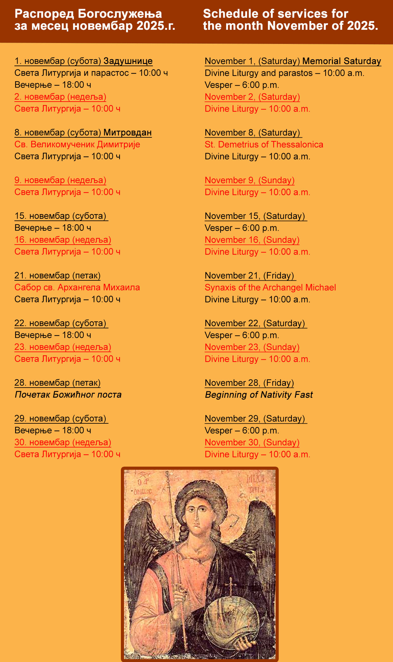 Света Литургија се служи сваке недеље у 10 часова изјутра.