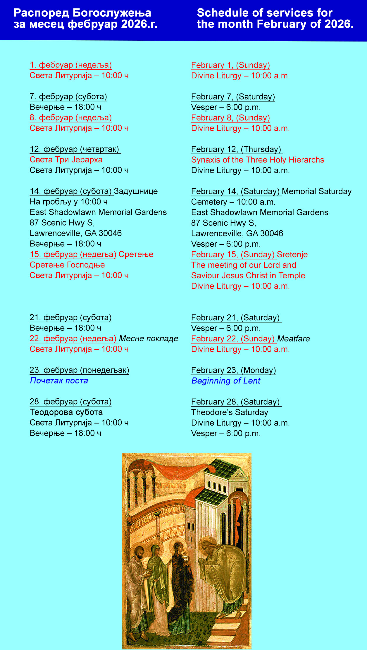 There might be slight changes in the calendar. Please, call Father Miladin to verify the schedule.
